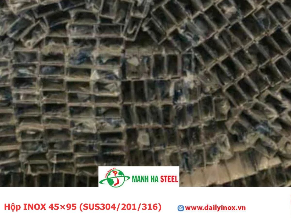 Hộp inox 45×95 tại dailyinox.vn được sản xuất từ các loại inox phổ biến như SUS201, SUS304 và SUS316 – trong đó inox 304 được ưa chuộng nhờ khả năng chống gỉ sét vượt trội, còn inox 316 phù hợp cho môi trường hóa chất, biển hoặc thực phẩm.