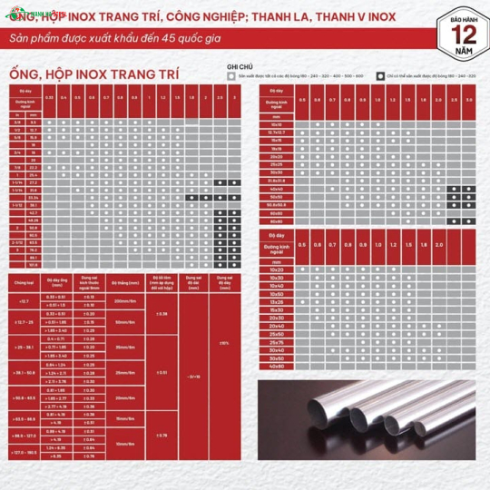 | Tiêu chuẩn chất lượng | ASTM A554, JIS G3459, TCVN ISO: 9001:2008 |