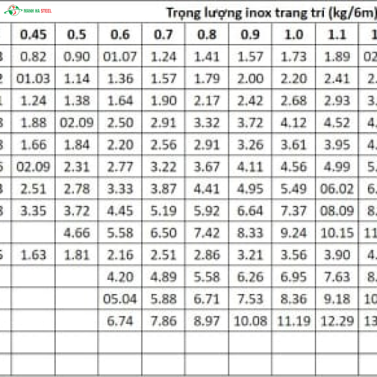 Bảng tra trọng lượng ống inox Gia Anh: