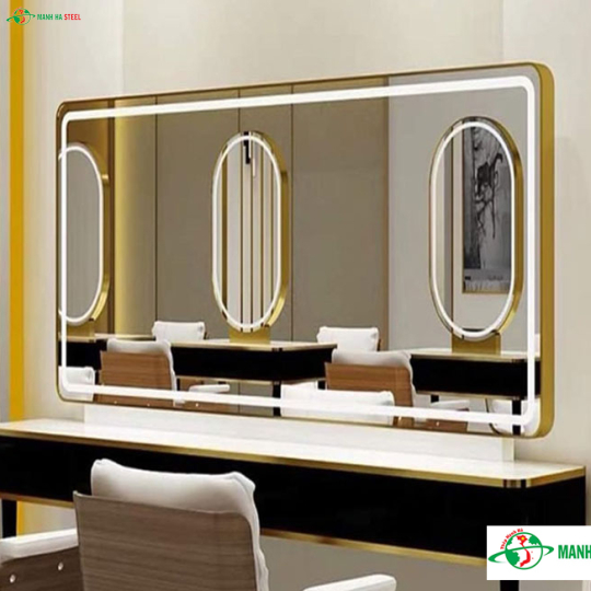 Inox mạ vàng được ứng dụng làm khung gương inox mạ vàng đang là xu hướng hiện nay. Trong thời đại mạng xã hội chia sẻ hình ảnh, những chiếc gương inox mạ vàng là vật trang trí không thể thiếu phía sau khung hình, giúp không gian hài hòa, đẹp mắt hơn.