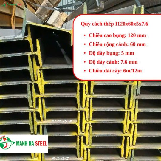 - Thép I120x60x5x7.6: 11.5 kg/m, 69 kg/cây 6m, 138 kg/cây 12m